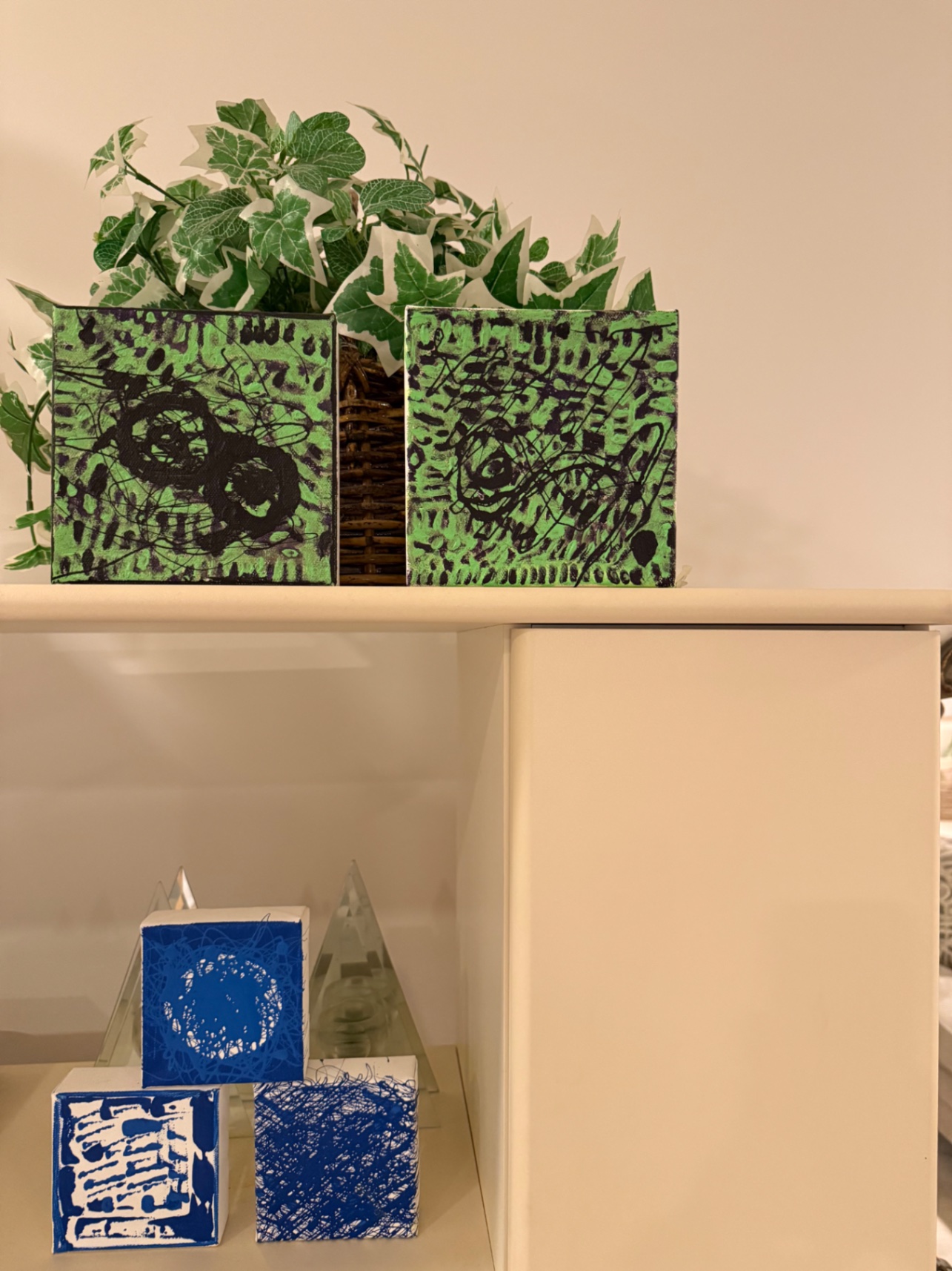 Line carries tempo—rhythm felt before seen. Blues and greens don’t sit still; they hum. Vibrations slip between control and instinct. When the mark is right, it holds attention like breath held too long. Not spectacle—suspension. The painting moves because it listens.